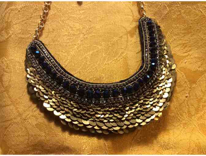 Such a unique item...its a must have for the Holiday Season. Is made by “Chico... The chain is pretty and is a gold color. The necklace itself is adorned with 2 rows of small crystals,1 row of beautiful blue crystal type beads and 9 rows of a type of “sequin” around the bottom edge, which are burnished or antiqued. The back of the necklace is lined with a satin material in navy blue color. It is a very unique piece of jewelry. Quite pretty....