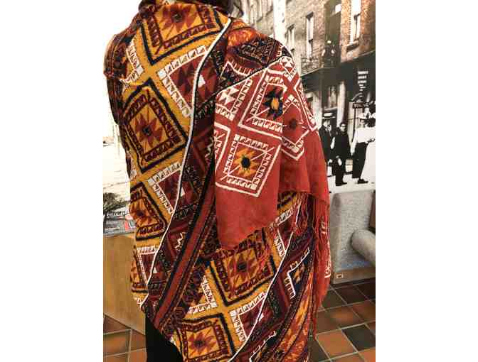Enjoy this large umber/burgundy and black scarf with beautiful design
