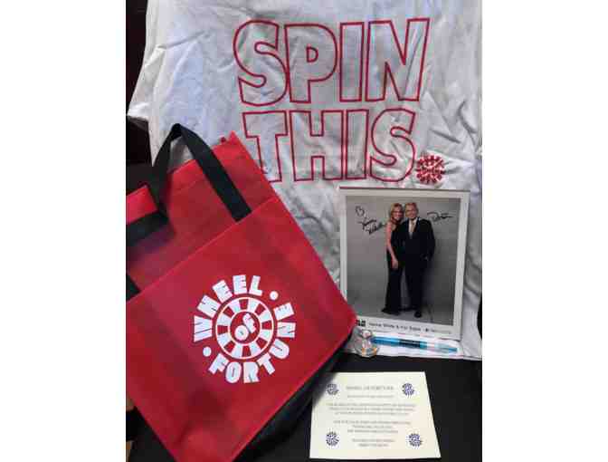 Includes Wheel of Fortune pen, key chain, "Spin This" t-shirt, autographed photo of Vanna and Pat, and production passes for 4 of taping at Sony Pictures Studios in Culver City, CA.