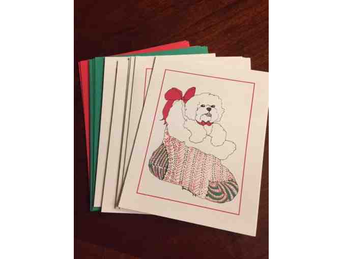 8 cards featuring playful Bichon's in various poses. 8 Envelopes included 4 red, 4 green