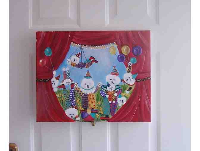 Just finished this one of a kind original Bichon Clown Painting 16"x20" I Manuela Poookie Quick especially created it for the Bichon Fund Raiser.I used non toxic acrylic paints.I use Poookie in memory of my beloved Bichon that resides by the Rainbow Bridge.We hope that it brings tons of goodies to the Bichons who are still here.Thank you for your generosity