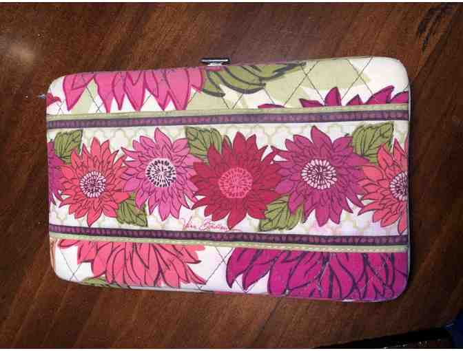 This VB clutch is also known as an opera wallet. It has been gently used and does show some wear on edges. It is 7.5L X 4.25H x 1W (all mesurements are in inches). It has a zipper change pocket on one side.