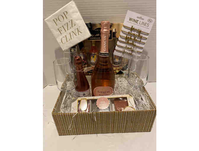 Get ready to Pop Fizz Clink with this fun basket of: Gancia Rose Sparkling Italian Wine, four (4) Issac Mizrahi Flutes, Champagne Toppers, Wine Lines Drink Markers, a Rose Candle Handmade in Spain and Pop Fizz Clink Napkins.