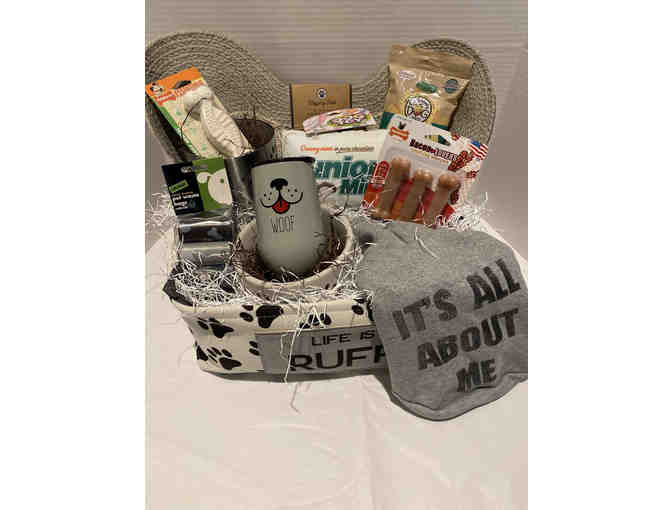 Show your pet a little love with a basket full of treats, that include: a Fab Dog "It's All About Me" Anorak Sweatshirt (Size Small), a Stainless Dog Treat Container, Pet Waste Bags (160 ct), Nylabone - Peanut Butter Flavor, Sandwich Creme Dog Treats, Junior Mints Dog Toy, Bacon Lover Nylabone, a Ceramic Dog Dish, Woof Travel Mug, Life is Ruff Basket and a Dog Bone Food Mat. Woof, woof!