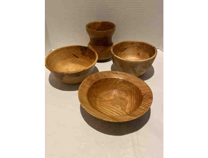 Real wood! Handcrafted! Add these three (3) wood (Maple and Black Locust)) bowls and a Cherry wood vase by P. Synder to your home. You'll love serving and displaying these functional pieces of art. Beautiful!