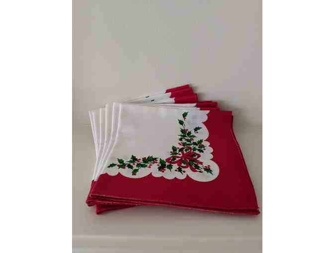 Set of six cloth napkins in red and white with holly design.