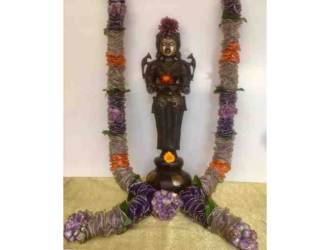 This is a purple, silver, orange, and green mala was worn and blessed by the Divine Mother and Shri Babaji at our Ashram here in Crestone. The size of this mala is 90" long. This would make an outstanding altar piece and mala for your murti or photograph. Invite Mother's and Babaji's energy into your home.