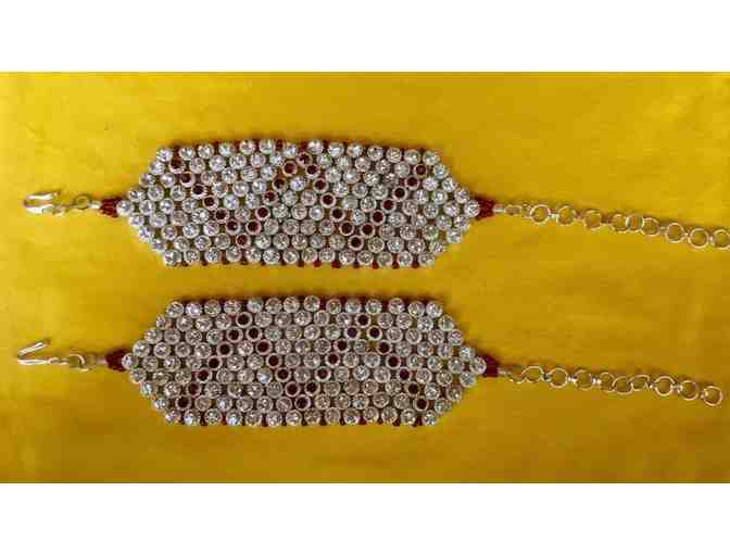 This very lovely and precious silver and red jewel encrusted bracelet set was worn by the Divine Mother in the Crestone temple for several years. Bracelets are a little bit more than 1.5 inches wide and have an adjustable chain for easy wear. Bracelets will fit a wrist up to 9 inches but can be adjusted to fit smaller wrists. Can be for personal use or for your Murti at home.