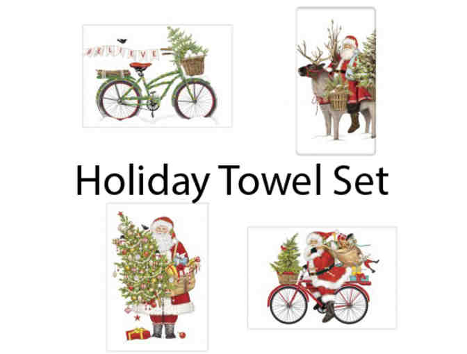 Set of 4 Holiday Dishtowels (Bicycle, Santa w/ Reindeer, Santa w/ Tree, Santa on Bike )