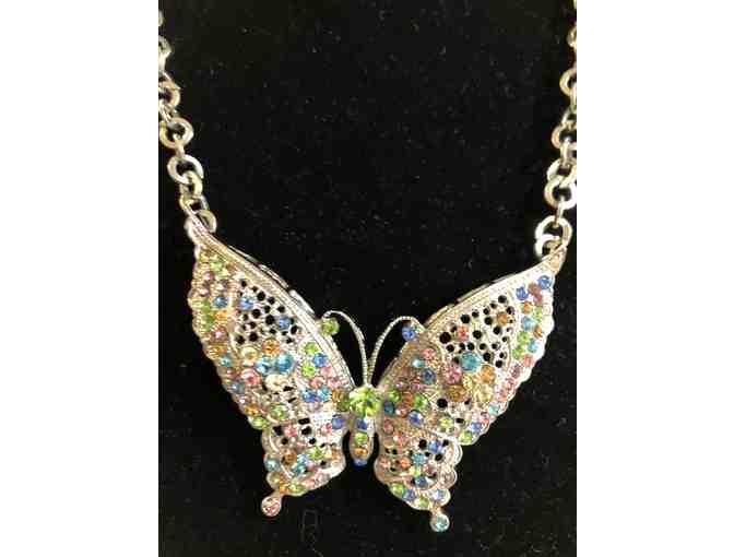 If you love butterflies you will want to own this beautiful silver and bling 16" necklace. Multicoloured bling stones.
