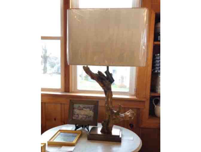 This beautiful 13 1/2“ x 20 1/4“ x 35 1/2“ tall lamp made of driftwood is a statement piece in any home. Want to view in person? Come to the Chamber and check it out.