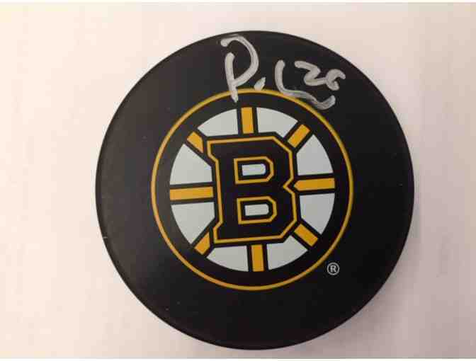 Autographed hockey puck by Boston Bruins forward Par Lindholm.