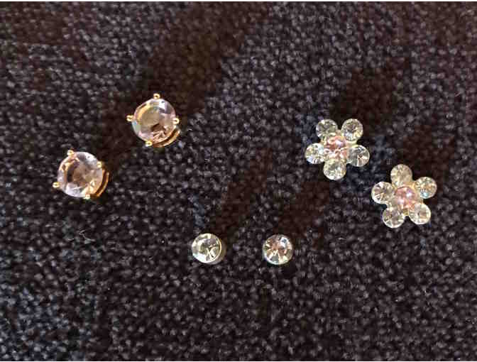 Three pairs of colorful and sparkly post earrings. Costume jewelry, great for dress up or for a young one's newly pirced ears.