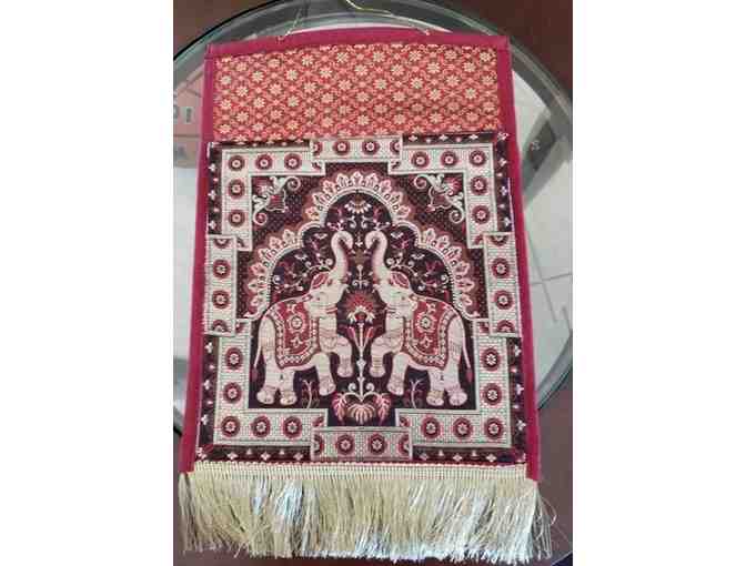 These beautiful wall hangings are embroidered with elephants and peacocks and have a handy pocket on the front to store mail or other important papers. This wall hanging is a red color and the size is 11x16". Use this as a fun piece to enliven your home!