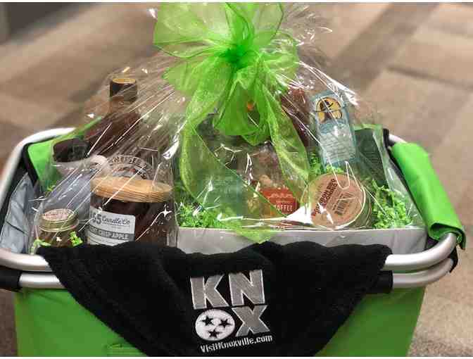 A picnic basket full of Tennessee goodies. Enjoy a cozy blanket , candle, Tennessee Single Malt Whiskey, Papi Joes Pepper Sauce, Syrup, Honey, Bourbon BBQ Seasoning mix, sweet treats from Tennessee Toffee and more. There's nothing like Fall in the smokies.