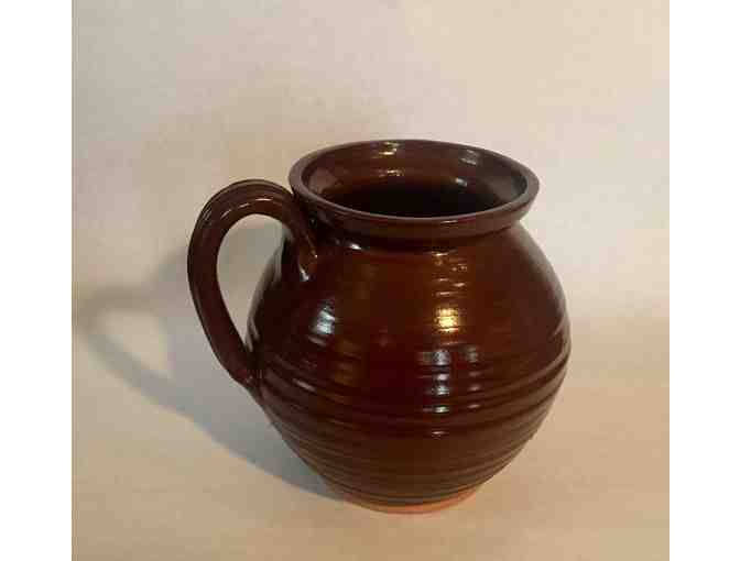 C. 2019. Hand-thrown redware bean pot with handle. Signed on the underside “Old Sturbridge Village.” Using early 19th century period correct methods, Old Strubridge Village tradespeople are committed to bring New England History to life through hands on experience and third person interpretation. This beanpot was thrown on a foot-powered wheel, glazed with period pigments, and fired in the wood-fire kiln.