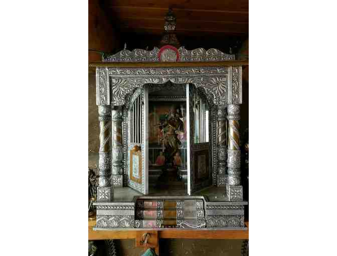 This very beautiful temple was donated by a family of devotees from Denver that recently purchased it but are now moving back East. The size is 20.5" in length x 17.5" in width x 34" in height. This temple can be used to display your murtis or anything else your creative mind can come up with. It has a handy drawer in the front to store puja items or clothes for your murti. Make sure you steal this one of a kind piece for your at home altar!