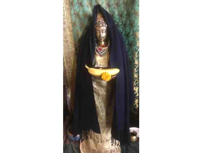 This is a very soft navy blue shawl that has been worn by the Divine Mother here at the Crestone Ashram. This shawl measures 72 x 25". Invite the energy of the Divine Mother into your life by wearing this shawl blessed with her love.