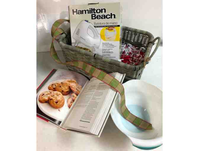 Includes America's Test Kitchen 100 Recipes Cookbook, a Hamilton Beach 6 speedhand mixer with storage case, and 2 BPA free mixing bowls with non-skid bottoms. All in a modern woven resin basket.