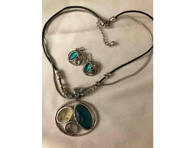 Black Rope and Silver Tone chain for this three colour stone Necklace with earrings