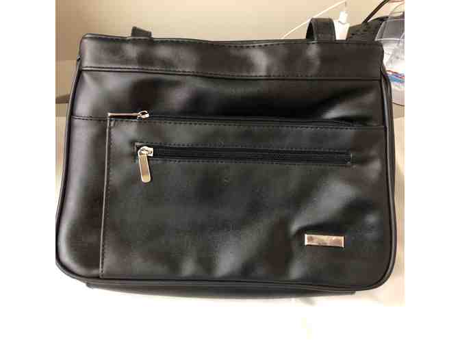 Black Pleather Purse with long shoulder straps and plenty of zippered pockets for storage