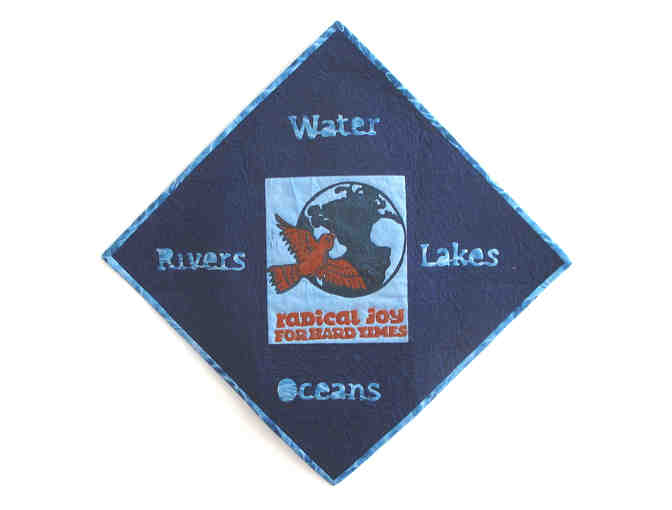 This quilt was made in response to the Radical Joy Global Earth Exchange my friend and I held in 2019. We honored the many forms of water that provide joy and life to us and our wonderful planet. We grieved the water that has been so polluted by humans in the oceans, lakes, rivers, and the water that we drink. The RadJoy lag that was provided for us is in the center of the quilt, reminding us to honor all of the water on the Earth.