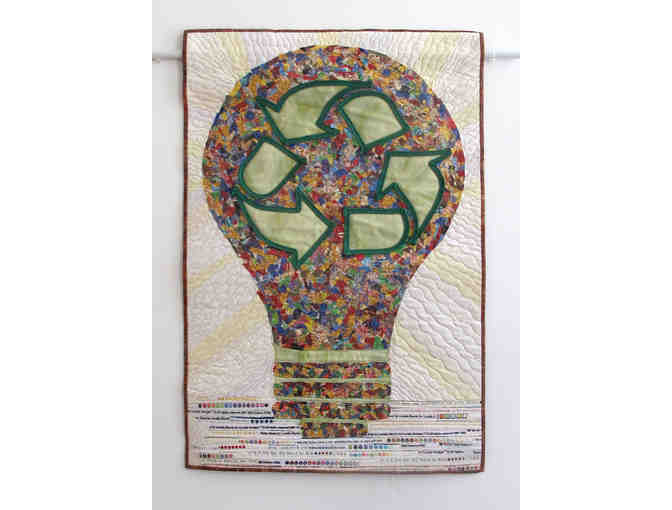 The idea behind this quilt was a challenge to use ONLY fabrics, threads and embellishments that we had on hand. We were NOT allowed to purchase anything new for the quilt. I thought that was the perfect idea of recycling and completed the quilt with fabrics I might otherwise not have used. In copying the arrows for the recycling symbol, I realized later that I made them backwards. The idea of recycling and using what we have, rather than throwing things away, is the bright idea.