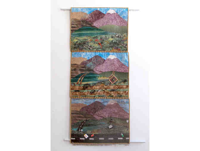 This quilt was made for the theme “Stories of Our Ancestors.” It depicts the transition of our beautiful, pristine Nature and air through the ruts and litter of household items and wagon wheels of our ancestors as they traveled west in America and the current smog and litter of just about anything. It’s a rather sad story of “progress” and shows how the real treasure that has been left behind is Nature in its original beauty. Pop-tops from cans make an aluminum fringe and adorn the bottom of the quilt.