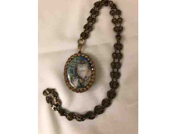 Locket Necklace w amber rhinestones surrounding a picture of cats
