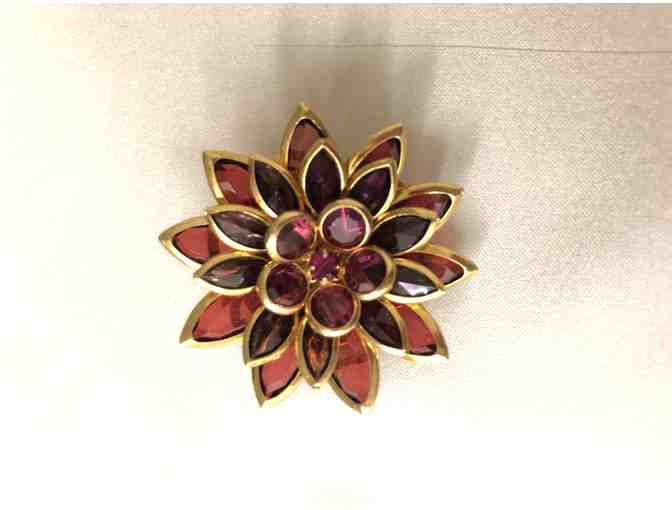Beautiful addition to lapel or scarf - Red glass stone with gold tone flower brooch