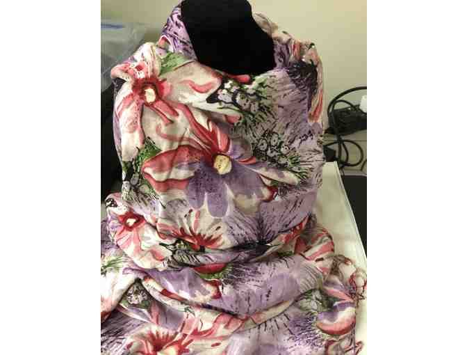 Large floral reds and purple and mauve scarf