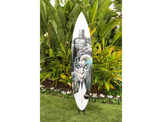Damian’s Batman surfboard is painted on a Brawner Board.