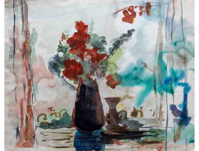 Vase with Red Flowers is a vibrant watercolor by artist, Irene Pastarnack. Although a still life, the flowing the color evokes movement and light. One can almost smell the red flowers in their tabletop vase.