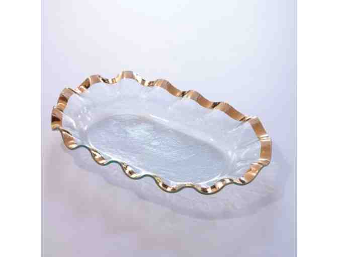An elegant thank you gift when only the best will do, Annieglass Ruffle Oval Serving Bowl is handmade in California from durable clear glass with an elegant ruffled edge of hand-painted 24k gold or genuine platinum.