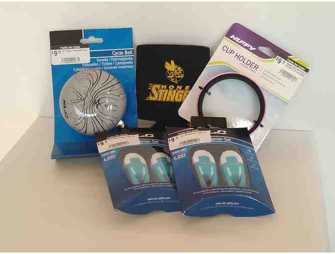 Included in the Bundle are Two (2) Minibeamer Light Sets, Huffy Cup Holder, a Cycle Bell "Grey", and a Honey Stinger Drink Cozy.
