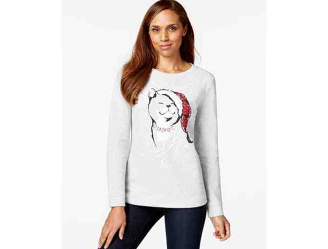 Adorable Christmas cat designer sweatshirt by Karen Scott. Heather grey with red and white sparkle accents. New with tags. Size Medium.