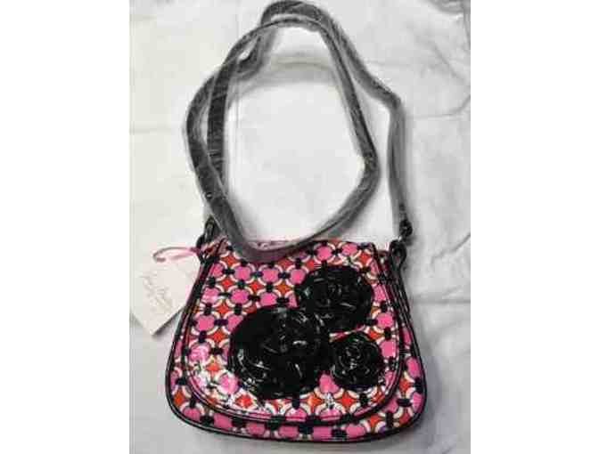Atypical Vera Bradley item. Plastic coated on the outside and strap--strap still in original paper to protect. Beautiful rosettes on the front flap with a magnet closure. Cloth lining, small pocket inside and zippered pocket on the back. 7 1/2 by 7 inches. Perfect for youth or youthful adult!!