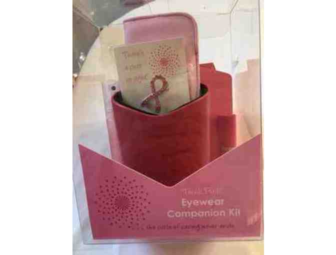 The kit contains the eyeglass holder (5" high X 2" wide). The other items are a microfibre cleaning cloth, lens cleaner, which is safe for all lenses, an eyeglass case (7" long X 2.5" wide), and a crystal breast cancer awareness pin.