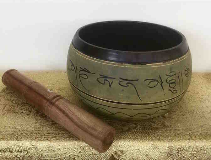 A beautiful Om Singing Bowl from India. This singing bowl is 5" in width and is about 4" tall. The sound created by this singing bowl is said to be Connected to the consciousness of the human spirit. In Tibetan tradition the powerful vibration of the singing bowl respond to the sound of the universal creation and inner consciousness. The bowl is used by placing it on the open palm of one hand. With the other hand lightly touch the bowl with the wooden stick, then keeping in contact with the bowl move the stick around the rim of the bowl. As the bowl sings it creates vibration of its own which effect the vibration of the air. Add some harmony in your practice with this beautiful singing bowl!