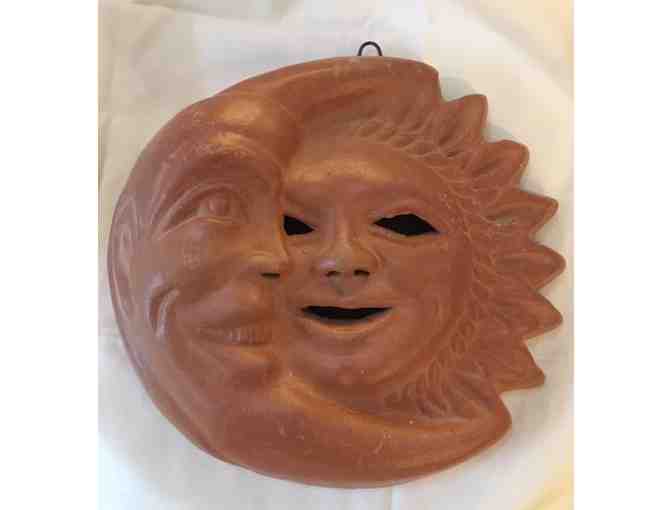 A beautiful Terra-cotta sun and moon wall hanging to add to your outdoor patio or in your home! This is a hand crafted art piece from Mexico which measures 9.5" high and 10" wide.