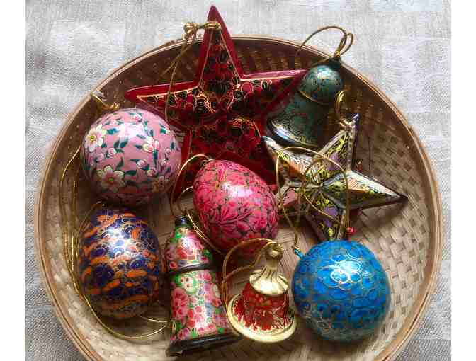 This is a one of a kind assortment of gorgeous hand-painted Christmas ornamnets from India. The bundle inculdes: two 3.5" eggs, two 3" balls, one 4" star and one 5" star, and three various sizes of bells 2, 2.5, and 3".