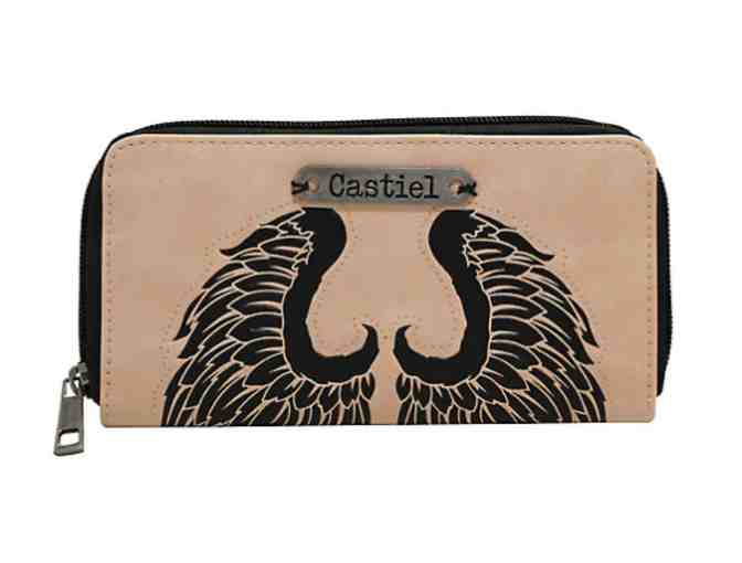 Everyone's fighting over which Winchester brother is their favorite and you're just sitting there, loving Cass - or is it Cas? Perhaps you do have a fight on your hands after all! This zip around wallet has a metal Castiel badge, and a wing print. Perfect for your Cass loving self. 12 card slots, billfold, zipper pouch.