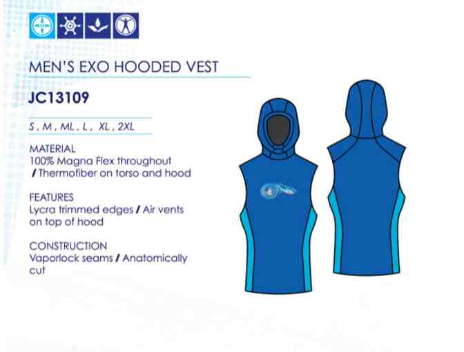 This offering is a new Men's Body Glove 6/3mm EXO Hooded Vest in size Medium Large. Colored in cool shades of blue and adorned with the new Jean-Michel Cousteau / Body Glove logo. Men's Size Medium Large.