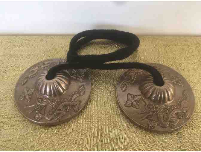 These beautiful Tingsha were hand casted by Tibetan artisans and engraved with a twin dragon design. They are held together with a cotton cord. They are used for meditation, when two pieces strike together they produce a clear, pure, sound to remove negative energies.