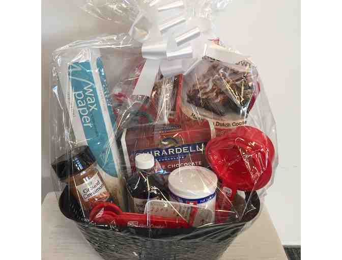 This gift basket, put together by the 3rd grade at The Grace School, includes an assortment of baking materials, including brownie mixes, measuring spoons, and frosting.