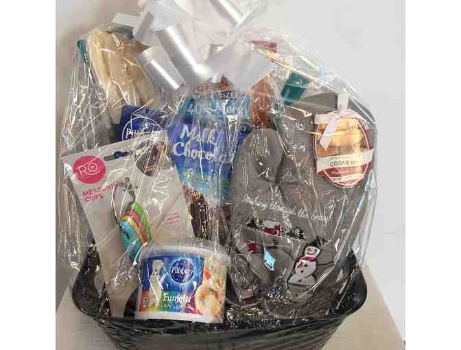 This gift basket, put together by the 3rd grade at The Grace School, includes baking items including brownie mixes, a cookie mitt, wooden spoons, and frosting!