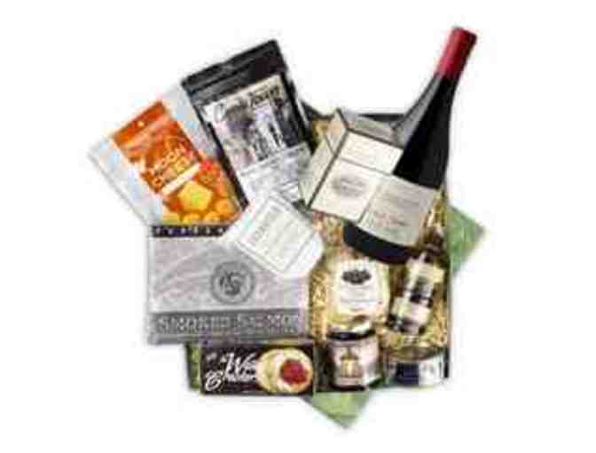 The Made in Oregon Exquisite Edibles gift basket features a 2018 Willamette Valley Vineyards "Whole Cluster" Pinot Noir, a well-rounded bottle to fit any occasion. Pairing with a curated selection of local gourmet favorites, like the Jacobsen Hand-Harvested Pure Flake Sea Salt from Netarts Bay and the lush Olive Oil & Balsamic Vinegar milled right in the Willamette Valley.