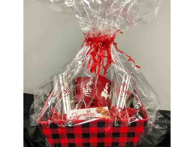 Basket includes 52 meal coupons, (2) two thermal cups, and Koozies