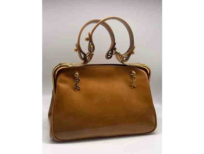 Roberto di Camerino handbag. Made in Italy. Gold frame with hinged closure. Patent leather tan with tan interiors. Interior slip pocket and wall zip pocket with "R" charm zipper pull. Tan leather double top handles. 4 small gold "R" charms too. Measurements L-10" H-6" Depth- 4.5" Strap drop - 4.5"