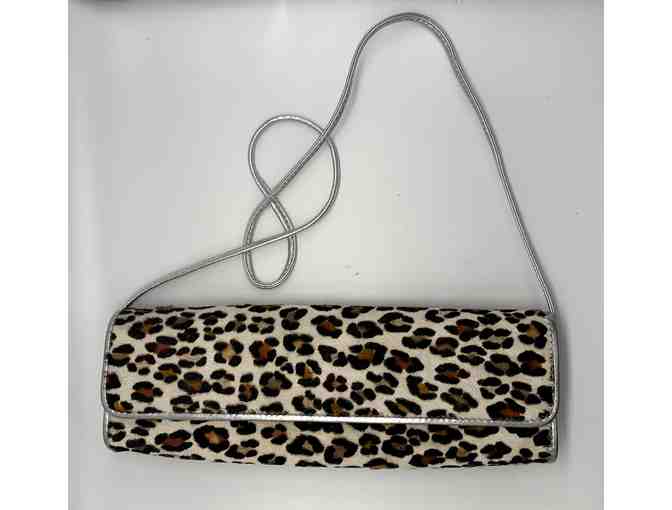 Carlos Falchi Fatto A Mano Leopard Print Clutch with Silver Trim and Thin Silver Strap